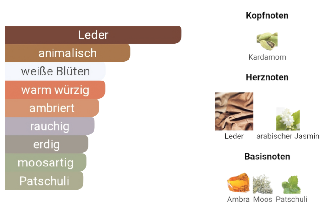 - Base note: Amber, Ambergris, Civet, Guaiac Wood, Incense, Labdanum, Leather, Moss, Oakmoss, Patchouli, Peru Balsam, Sandalwood, Smoke, Tolu Balsam, Vanilla, Vetiver, White Musk