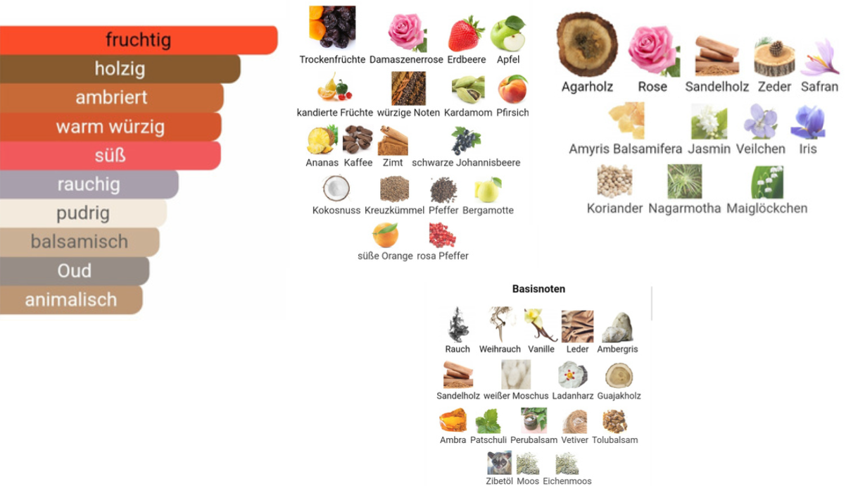 Olfactory pyramid- Head note: Apple, Bergamot, Black Currant, Candied Fruits, Cardamom, Cinnamon, Coconut, Coffee, Cumin, Damask Rose, Dried Fruits, Peach, Pepper, Pineapple, Pink Pepper, Spicy notes, Strawberry, Sweet Orange