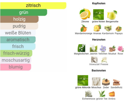 - Head note: Bergamot, Cardamom, Green Notes, Lemon, Mandarin Orange, Papaya, Pineapple