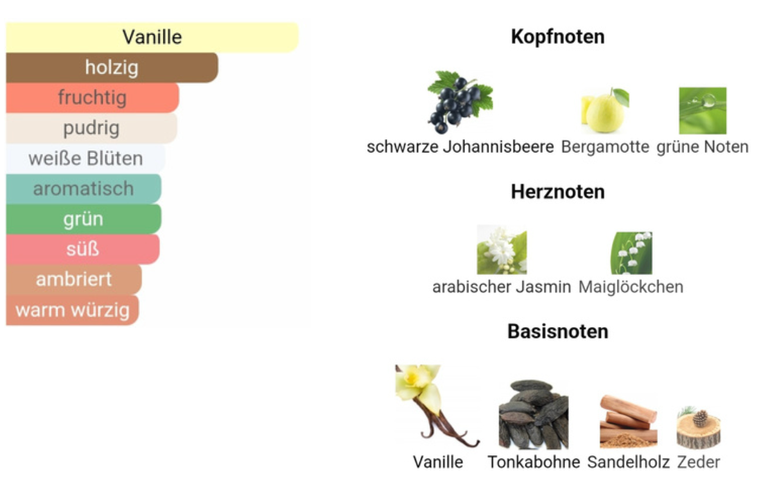 - Base note: Cedar, Sandalwood, Tonka Bean, Vanilla