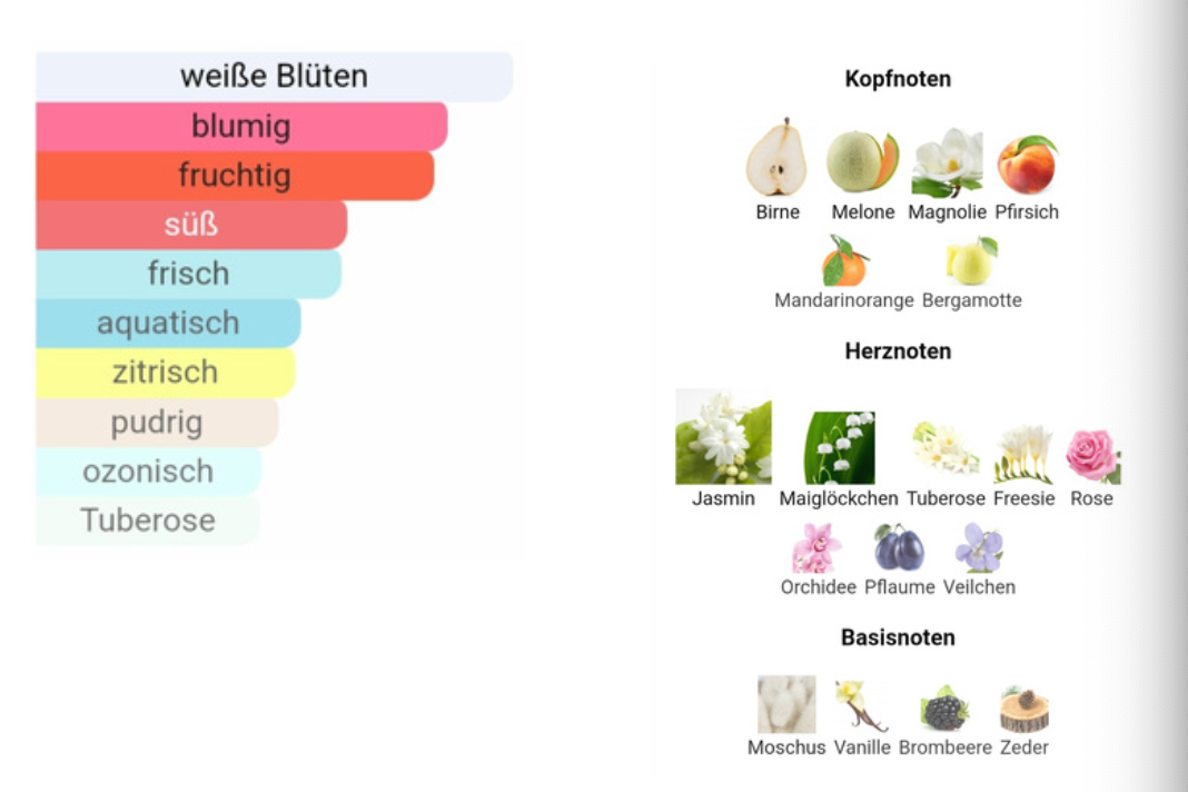 - Heart note: Freesia, Jasmine, Lily-of-the-Valley, Orchid, Plum, Rose, Tuberose, Violet