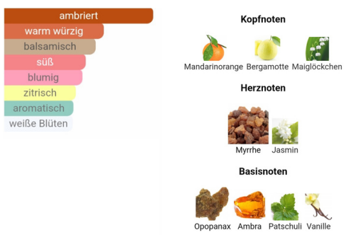 - Base note: Amber, Opoponax, Patchouli, Vanilla
