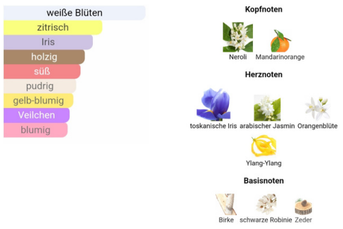 - Heart note: Iris, Jasmine, Orange Blossom, Ylang-Ylang