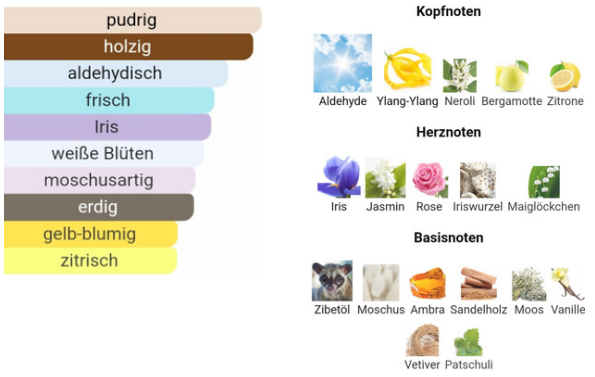 - Head note: Aldehydes, Bergamot, Lemon, Neroli, Ylang-Ylang