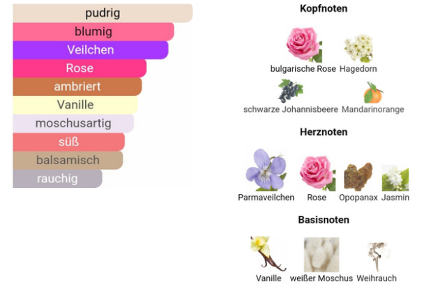 - Heart note: Heliotrope, Iris, Jasmine, Rose