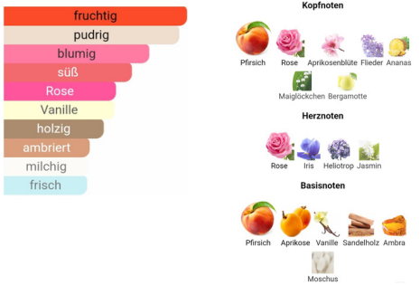 - Base note: Amber, Apricot, Musk, Peach, Sandalwood, Vanilla