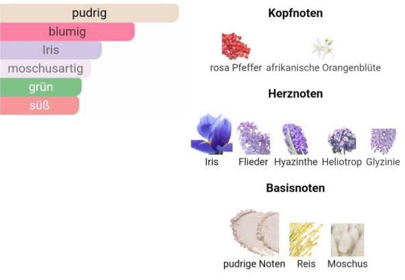 - Heart note: Heliotrope, Hyacinth, Iris, Lilac, Wisteria